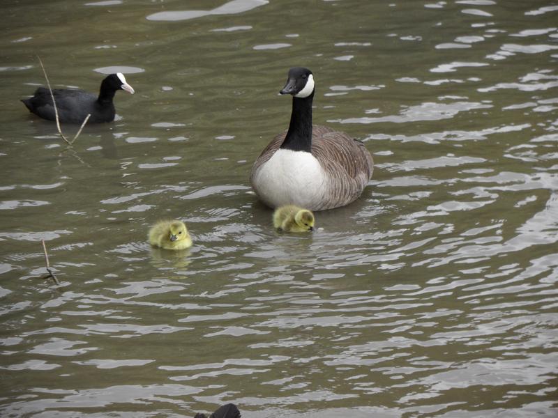 The Canada Geese family again, with a slightly older gosling near the