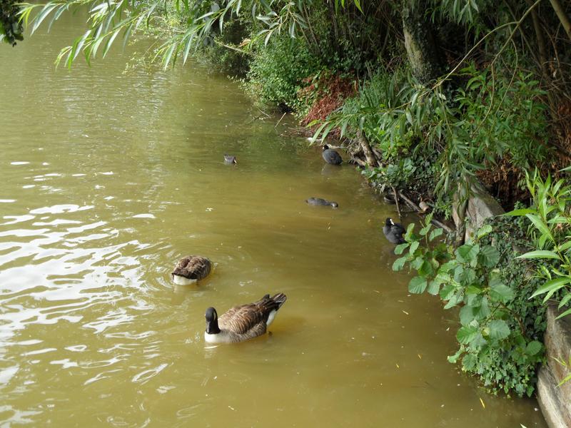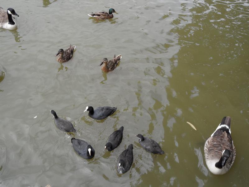 April 2011, three Mallards, five Canada Geese, two Coots and a Tufted Duck (I think, although can not see a tuft on the neck).