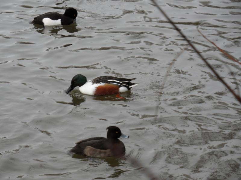 A Shoveler Duck in the middle, a male Tufted Duck at the top, a female Tufted duck at the bottom.