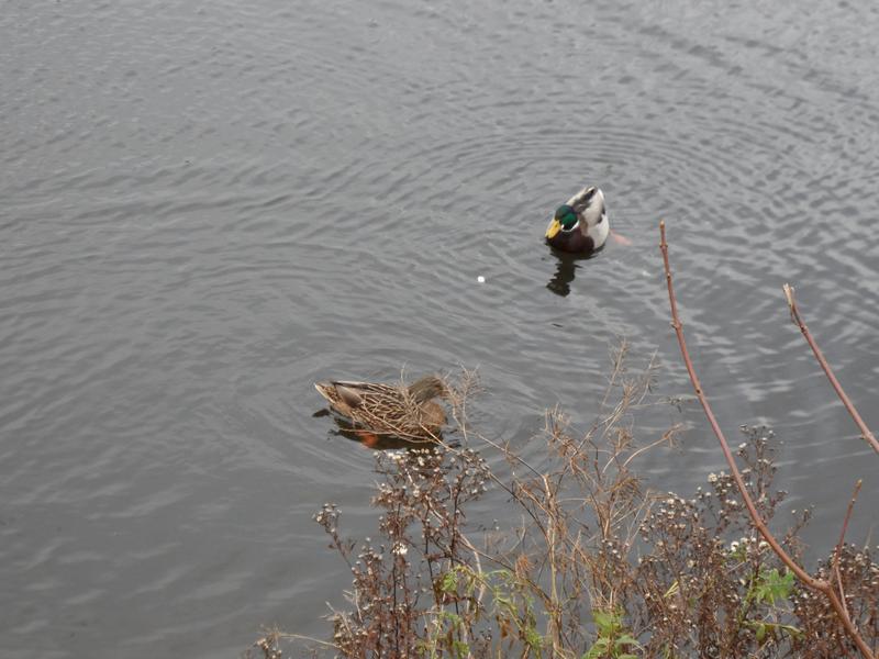 Christmas 2011, three pairs of Mallards this visit, these two hiding on the small pond, and did not move when I threw food in the water.
