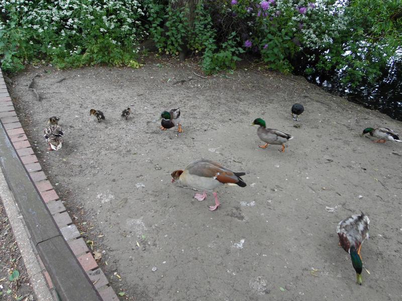 The ducklings seem quite tame, eating pellets off the path next to park visitors, and Egyptian Goose is also hungry.