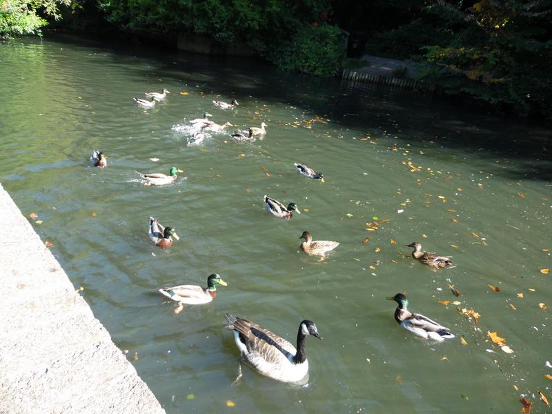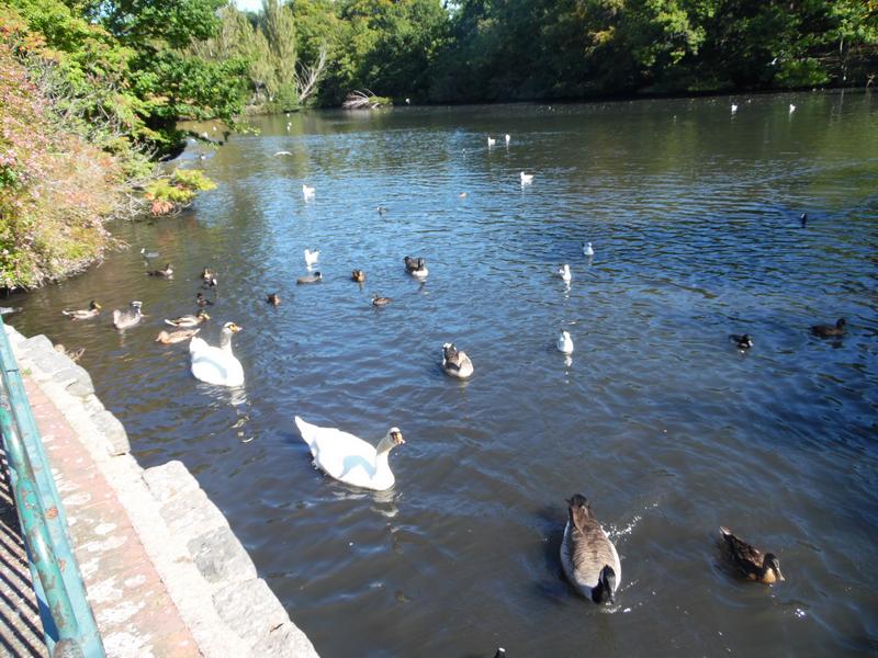 Difficult to feed the ducks and geese, the sea gulls dive bomb and grab the bread.
